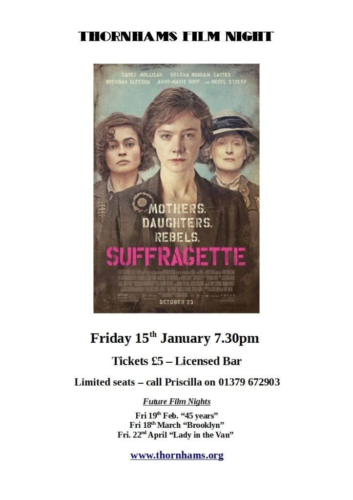 Thornhams Film Night “SUFFRAGETTE” Tickets £5, Licensed Bar. Limited seats – to book call Priscilla on 01379 672903.
